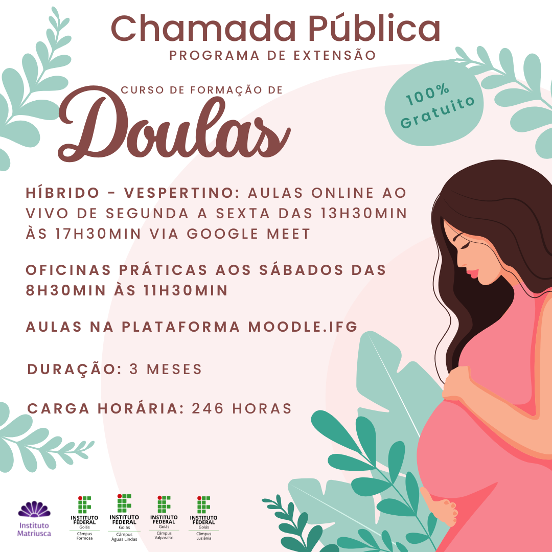 O Instituto Federal de Goiás (IFG) câmpus Águas Lindas, Formosa, Luziânia e Valparaíso estão com inscrições abertas, a partir desta segunda-feira (6/3), para a segunda turma do curso de formação de doulas. O programa de extensão do IFG é ofertado em parceria com o Instituto Matriusca.