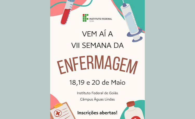O Câmpus Águas Lindas do Instituto Federal de Goiás (IFG) irá realizar, de 18 a 20 de maio, a VII Semana de Enfermagem. O evento é gratuito e voltado à comunidade acadêmica. A abertura será na próxima na quinta-feira (18), às 19h, com a palestra que traz o tema do evento: “O letramento em saúde como método de valorização do profissional técnico em Enfermagem”, no auditório.
