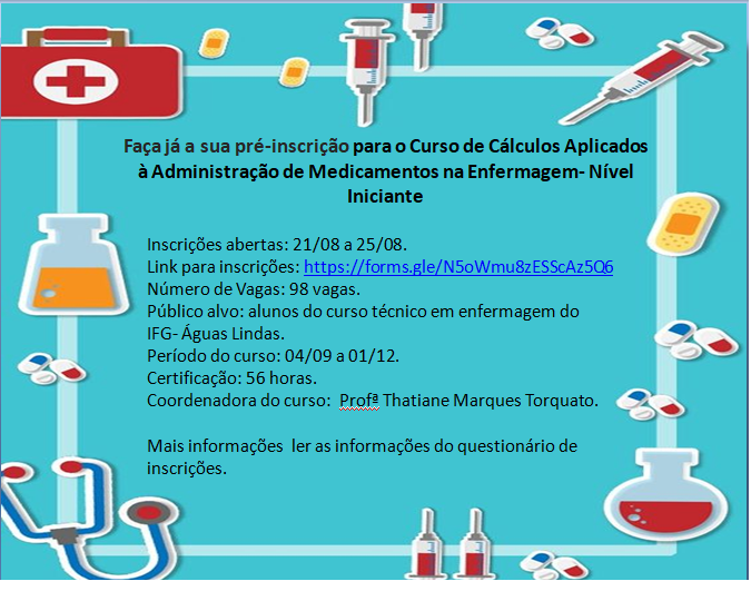 O projeto de ensino Cálculos Aplicados à Administração de Medicamentos na Enfermagem (nível iniciante) está com inscrições abertas a partir desta segunda-feira, 21. São ofertadas 98 vagas para os estudantes do curso técnico em Enfermagem na modalidade Educação de Jovens e Adultos (EJA) do Câmpus Águas Lindas. As inscrições podem ser feitas até a próxima sexta-feira, 25, por meio do preenchimento do formulário: https://forms.gle/N5oWmu8zESScAz5Q6.