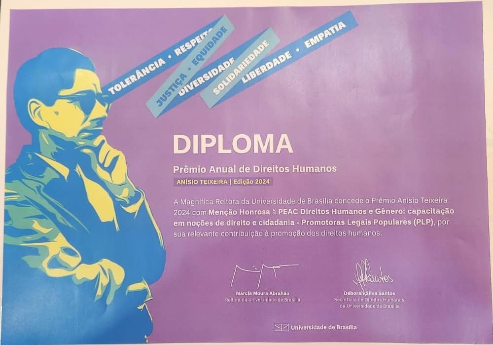 O projeto de extensão Promotoras Legais Populares (PLPs) recebeu na tarde da última terça-feira, 18, a menção honrosa no Prêmio Anísio Teixeira de Direitos Humanos, realizado no auditório da Reitoria da Universidade de Brasília (UnB), Câmpus Darcy Ribeiro. A premiação visa reconhecer e valorizar iniciativas de excelência realizadas no ensino, na pesquisa e na extensão universitária, que contribuam com a consecução dos objetivos da política de Direitos Humanos da universidade.