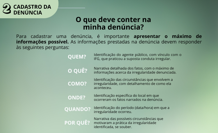 A “Cartilha Simplificada de Orientação ao de Orientação ao Manifestante – FalaBR: Como faço para denunciar uma irregularidade?”, lançada pela reitora do IFG hoje pela manhã, tem por objetivo ser um documento institucional para orientar a comunidade do Instituto Federal de Goiás (IFG) sobre o Canal de Denúncias, a Ouvidoria, indicando os requisitos mínimos que devem constar nas manifestações, de forma a garantir maior efetividade nos procedimentos de apuração de possíveis irregularidades no âmbito da Instituição.