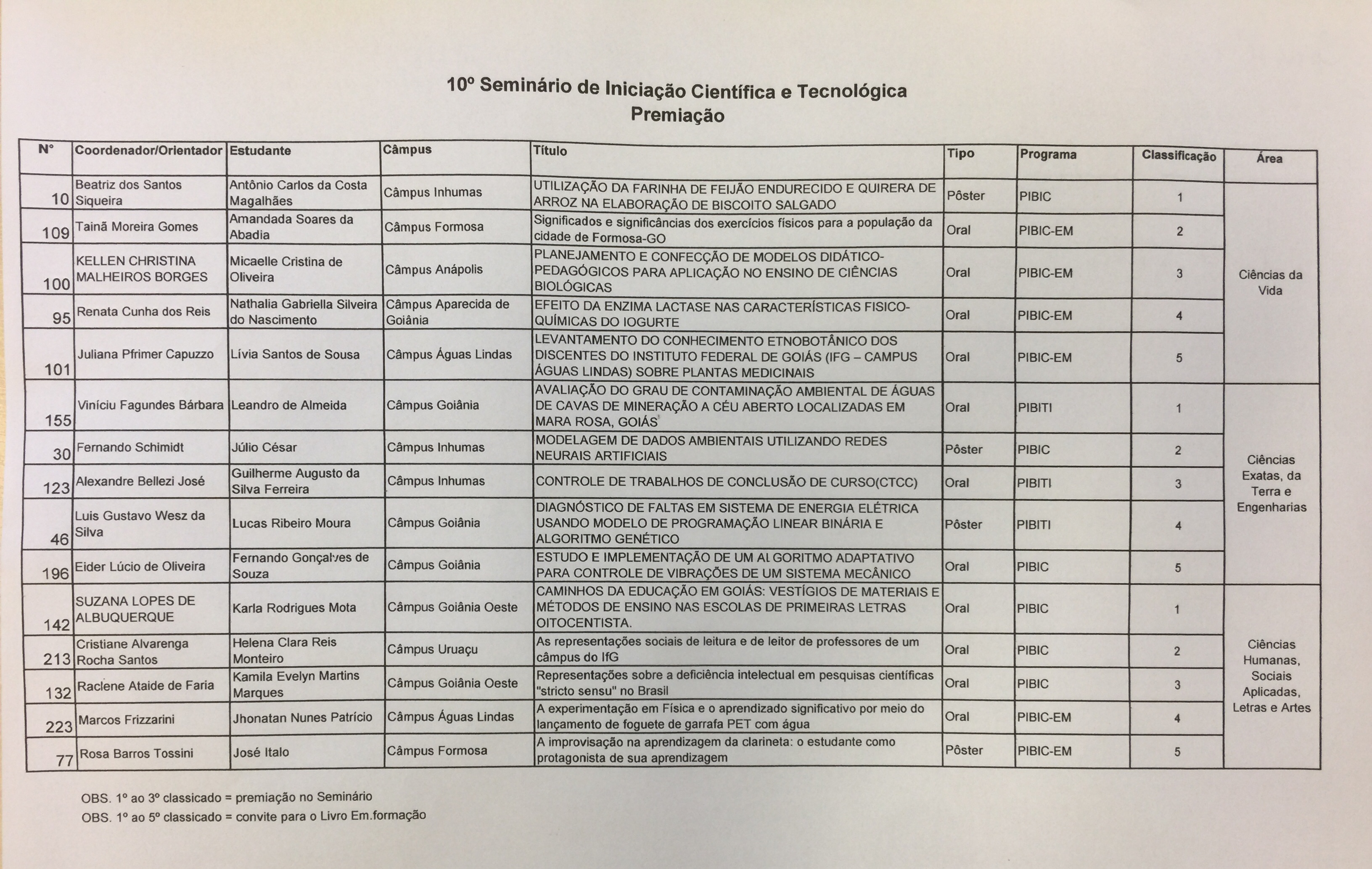 No Câmpus Águas Lindas foram contemplados os trabalhos: Levantamento do conhecimento etnobotânico dos discentes do Instituto Federal de Goiás (IFG-Câmpus Águas Lindas) sobre plantas medicinais, desenvolvido pela professora Juliana Pfrimer Capuzzo e a estudante Lívia Santos de Sousa; e A experimentação em Física e o aprendizado significativo por meio do lançameto de foguete de garrafa PET com água, de responsabilidade do professor Marcos Frizzarini e do estudante Jhonatan Nunes Patrício.
