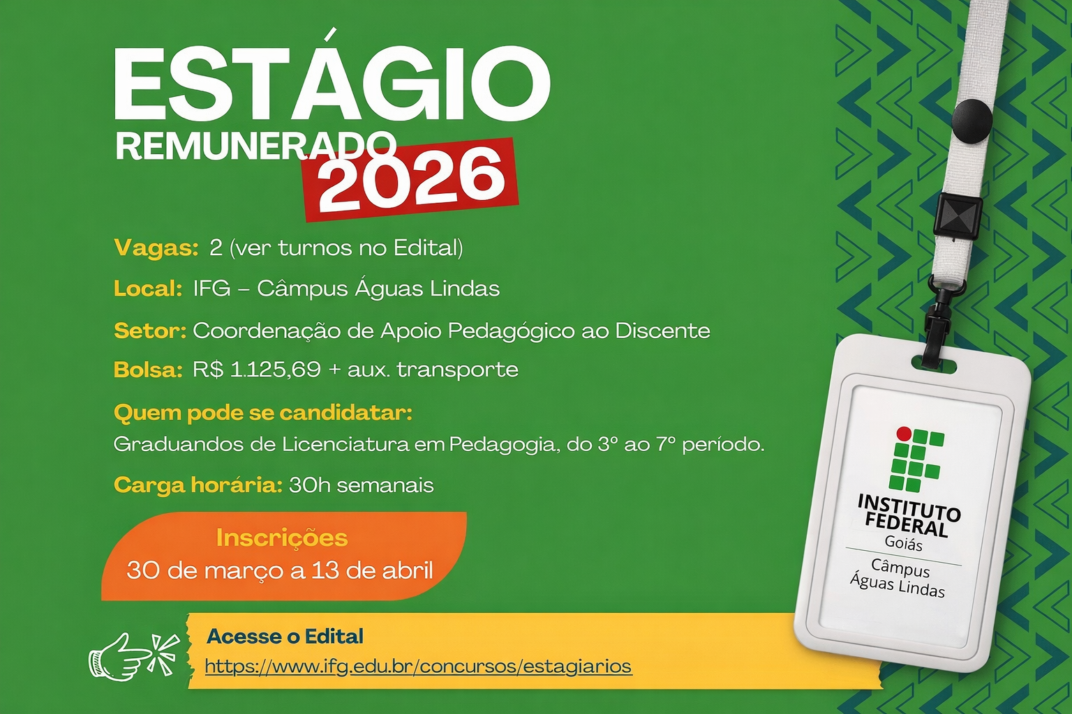 São ofertadas 2 vagas e as inscrições podem ser realizadas entre os dias 30 de março e 13 de abril de 2026