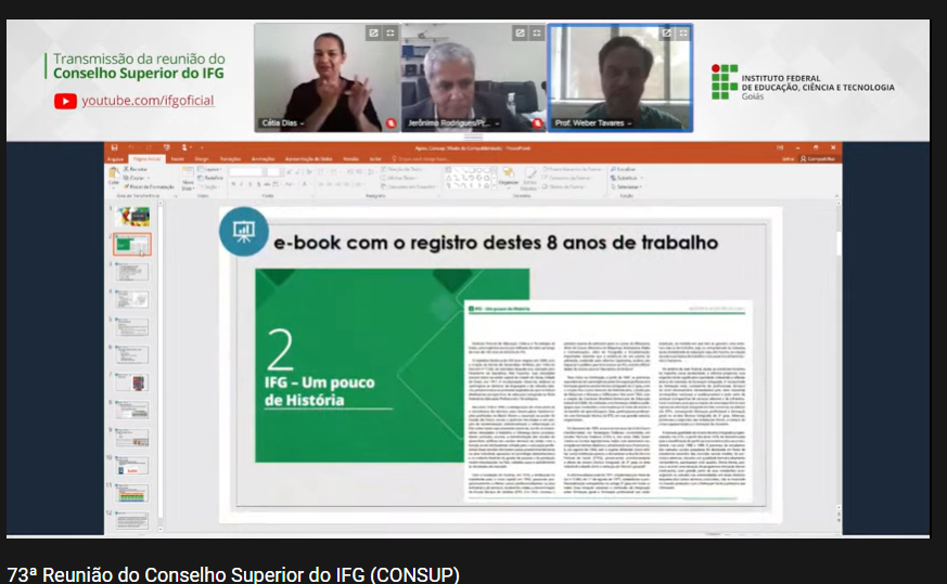 No último dia de seu mandato eletivo como reitor do Instituto Federal de Goiás (IFG), o professor Jerônimo Rodrigues da Silva presidiu a 73ª edição da reunião do Conselho Superior da Instituição e, nela, aproveitou para agradecer a comunidade acadêmica pela confiança depositada ao longo dos anos em que esteve à frente da Reitoria do IFG. Durante a reunião, o gestor convidou o professor Weber Tavares para apresentar alguns dados sobre a gestão da Instituição nos últimos 8 anos. As informações sobre esse período estão presentes em um relatório. O documento, em fase final de editoração, deve ser disponibilizado em formato e-book à comunidade acadêmica nos próximos dias.