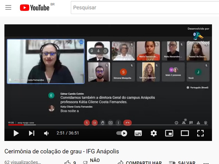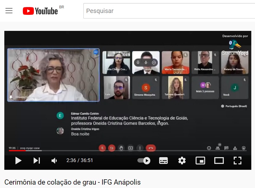 O Instituto Federal de Goiás (IFG) - Câmpus Anápolis promoveu na noite desta quinta-feira, 20, a colação de grau de quatro formandos dos cursos de Engenharia Civil da Mobilidade (Luiz Gustavo Baliza Ramos e Tatiane Guedert Moreira) e de tecnologia em Logística (Marcos Paulo da Silva Rodrigues e Ridis Alexandre da Silva). A cerimônia foi transmitida ao vivo pelo canal do IFG Anápolis no YouTube e a gravação pode ser acessada por meio do link a seguir: https://www.youtube.com/watch?v=UsESnE2dA6U