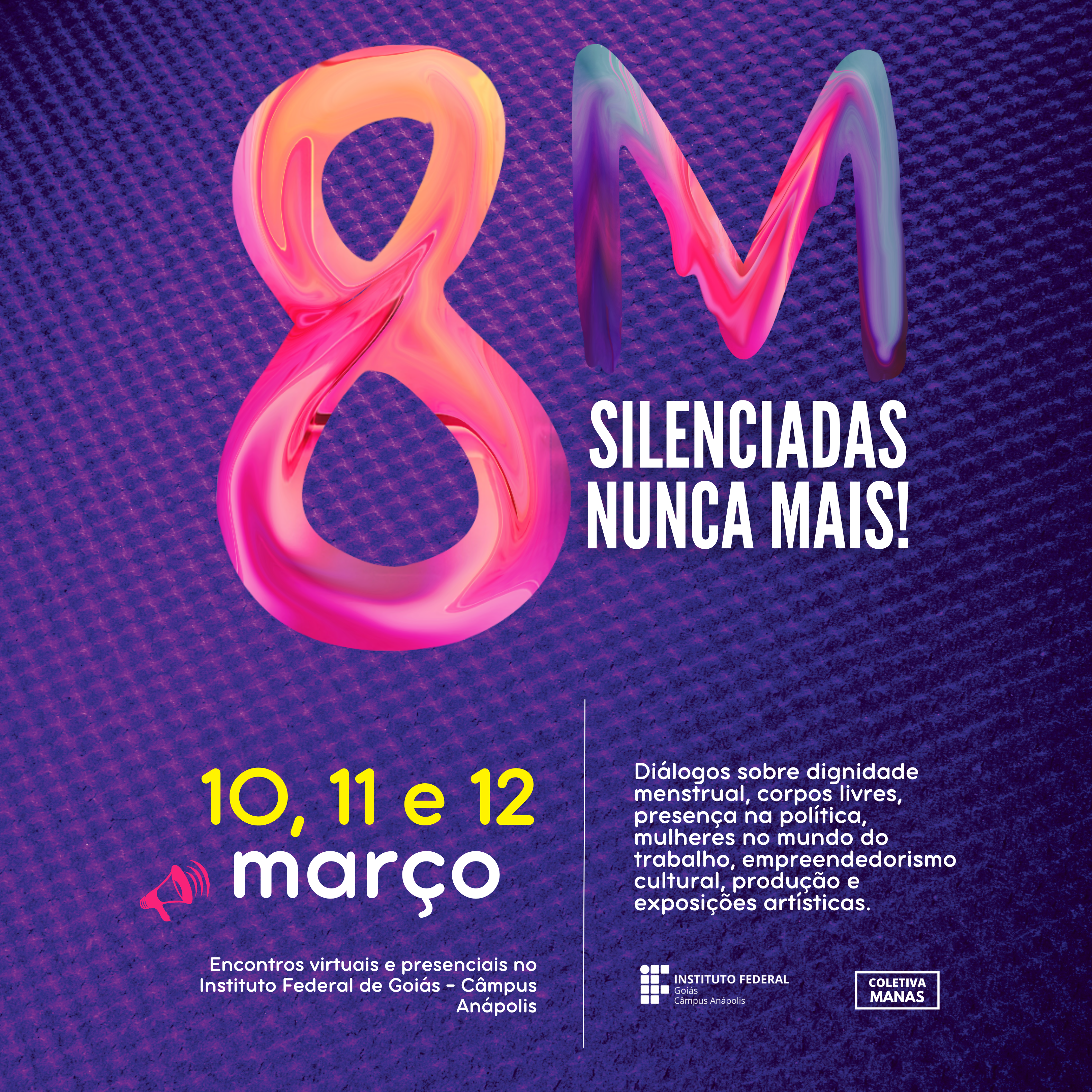 O Instituto Federal de Goiás (IFG) – Câmpus Anápolis e a Coletiva Feminista Manas promovem a partir desta quinta-feira, 10, a Semana da Mulher 2022. Com o tema "Silenciadas nunca mais!", a edição deste ano será realizada nos dias 10, 11 e 12 de março. O evento oferece certificação e as inscrições podem ser realizadas no site www.computacaoifg.com.br/gci . A comissão organizadora elaborou uma programação que abordará diversas temáticas importantes tais como dignidade menstrual, maternidade e representatividade feminina no mercado de trabalho e na política.