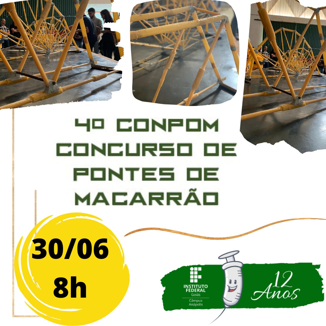 O IFG Anápolis realiza, pelo quarto ano, o Concurso de Pontes de Macarrão (Conpom). O evento faz parte da programação do aniversário do câmpus e podem participar alunos regularmente matriculados nas matérias Concreto I e Resistência dos Materiais I do curso de Engenharia Civil da Mobilidade. O participantes poderão formar grupos de até cinco integrantes. As equipes deverão entregar suas pontes no laboratório de Engenharia Civil da Mobilidade, às 9h15 do dia 30 de junho, juntamente com o memorial de construção da ponte, anexo 1 do Edital.