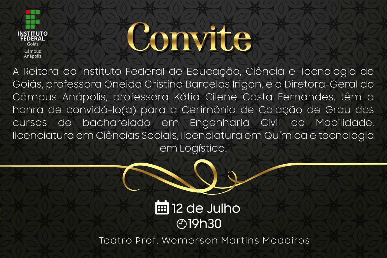 O Câmpus Anápolis do Instituto Federal de Goiás (IFG) realiza na próxima terça-feira, 12 de julho, a cerimônia de colação de grau do primeiro semestre de 2022 dos formandos dos cursos superiores de licenciatura em Ciências Sociais, bacharelado em Engenharia Civil da Mobilidade, licenciatura em Química e tecnologia em Logística. A solenidade, que contará com a presença da reitora do IFG, Oneida Irigon, e da diretora-geral do Câmpus, Kátia Fernandes, será realizada às 19h30, no Teatro Professor Wemerson Martins Medeiros.
