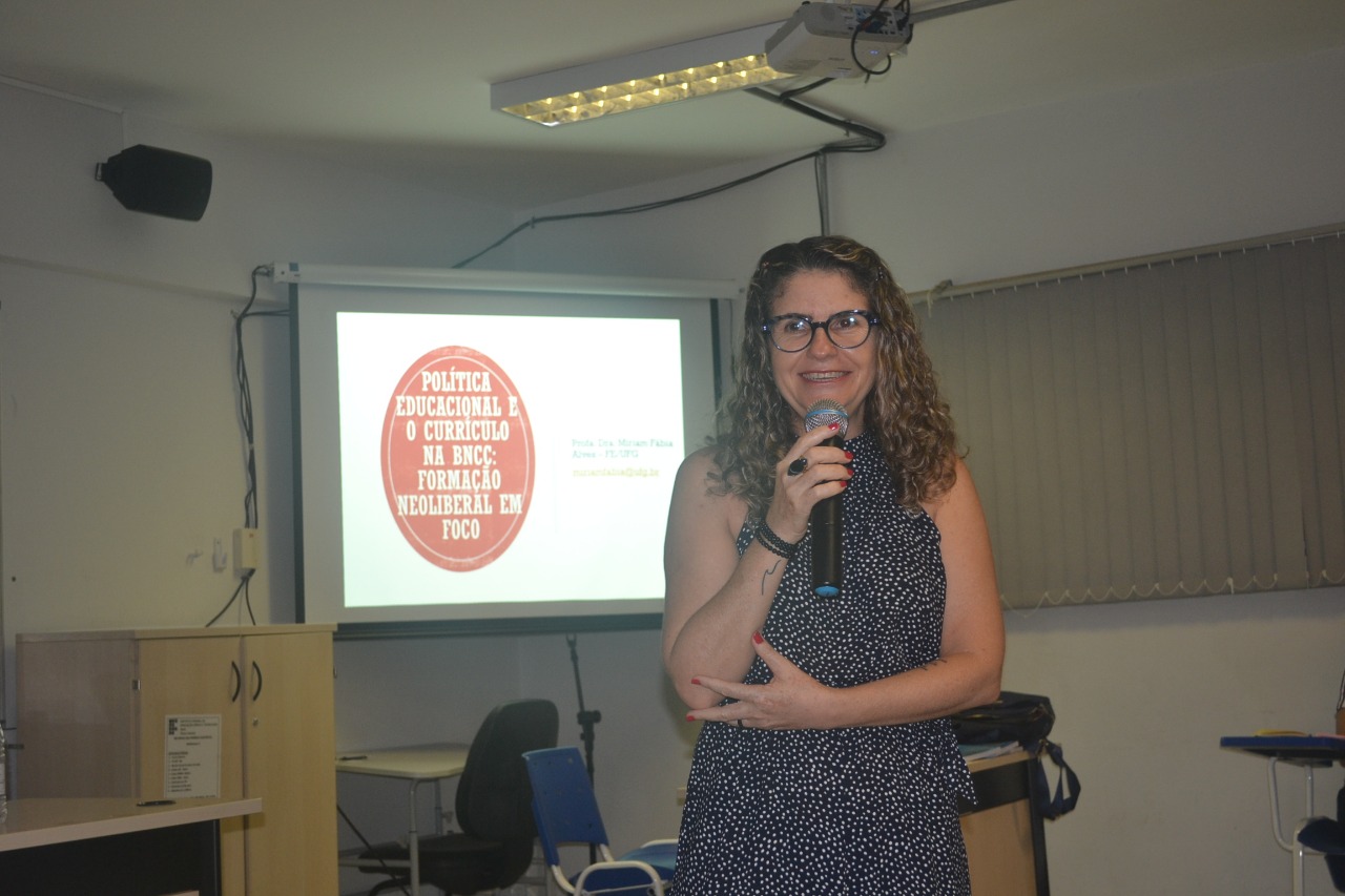 O Câmpus Anápolis do Instituto Federal de Goiás (IFG) promoveu na noite desta segunda-feira, 26, o primeiro encontro do curso de extensão “Diálogos sobre educação, sociedade e políticas públicas”. A convidada para a atividade de abertura foi a professora Miriam Fábia Alves (UFG) que abordou o seguinte tema: “Política educacional e o currículo na BNCC: formação neoliberal em foco”.