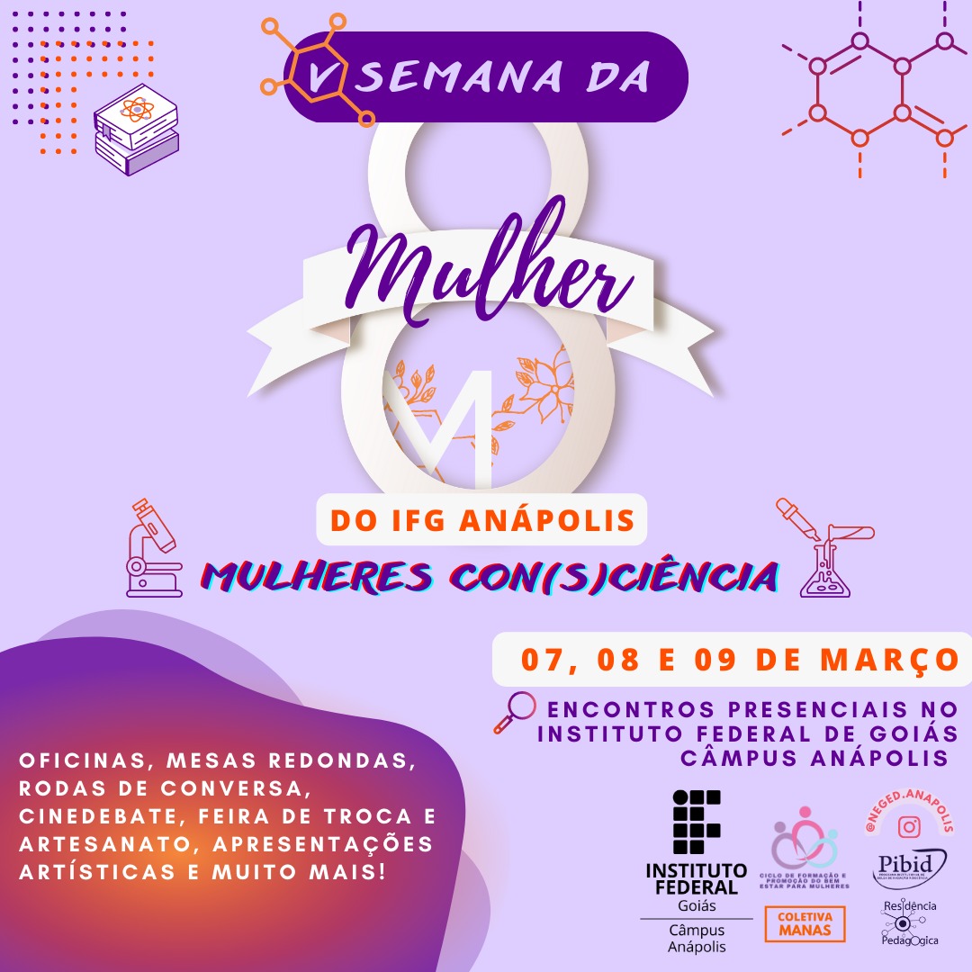 O Câmpus Anápolis do Instituto Federal de Goiás (IFG) promove nos dias 7, 8 e 9 de março a V Semana da Mulher do IFG Anápolis. O evento tem como tema “Mulheres Con(s)ciência” e a programação está bastante diversificada, envolvendo diversas oficinas, palestras, rodas de conversa, além de Cinedebate e a III Feira de Troca e Economia Solidária. O evento oferecerá certificação e as inscrições podem ser realizadas no site www.computacaoifg.com.br/gci .