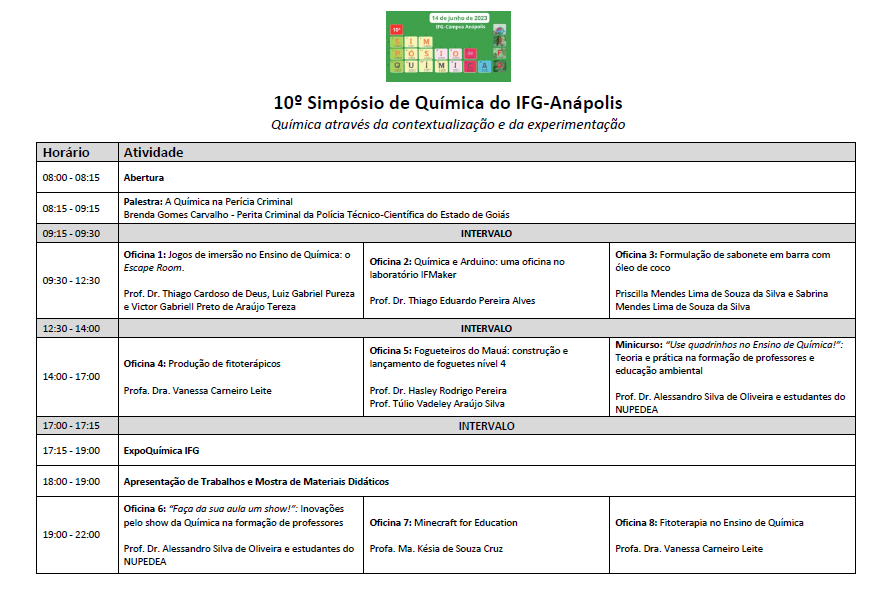 A programação do X Simpósio de Química do IFG Anápolis foi divulgada nesta segunda-feira, 29. O evento acontece no dia 14 de junho, de forma presencial, e se compõe de palestra, oficinas, minicurso e a ExpoQuímica IFG, com a exposição de materiais didáticos apresentados por participantes do evento. Haverá também espaço para apresentação de trabalhos acadêmicos.