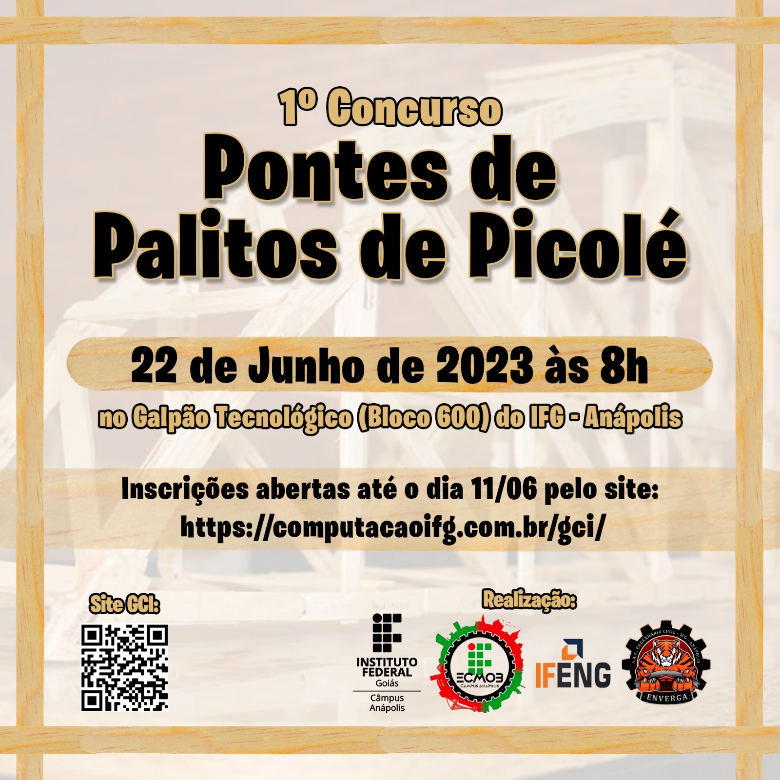 O 1º Concurso de Pontes de Palito de Picolé está sendo organizado em conjunto pelo curso de Engenharia Civil da Mobilidade do Câmpus Anápolis, pela empresa júnior do curso IFENG Engenharia e Consultoria e pela Atlética Enverga – Associação Atlética Acadêmica de Engenharia Civil da Mobilidade.