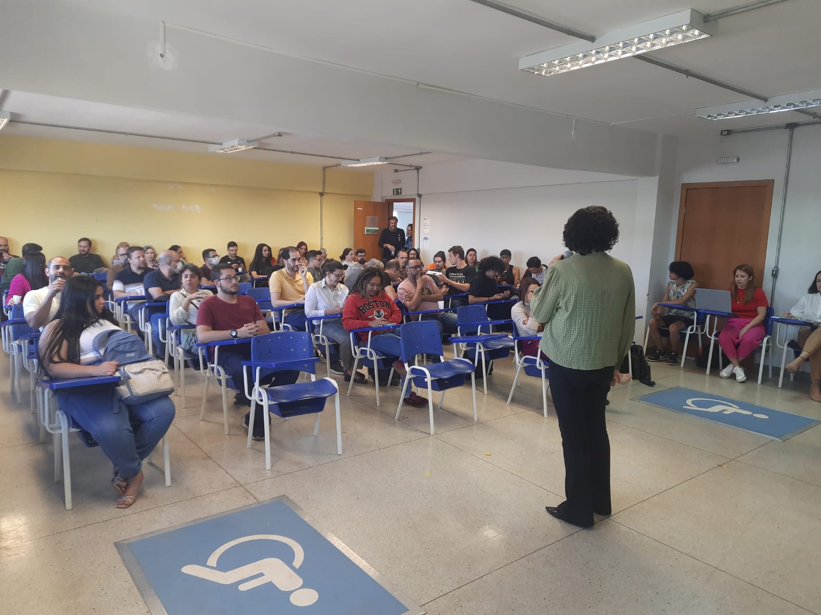 Em seguida, Kátia apresentou a comissão responsável por conduzir o processo eleitoral, composta por ela e os servidores Amanda Neves e Wilsovelton Teles, detalhou a sequência da reunião e explicou o que determina a Portaria 2.115/2023, que regula o processo de eleição. Logo após, passou a palavra ao professor Matheus, que apresentou sua plataforma de atuação à frente da chefia. Após a apresentação de Matheus, foi aberto espaço para perguntas dos presentes e não houve manifestações. Passou-se então à votação, que foi realizada de forma eletrônica. Todos os presentes haviam assinado a lista de presença e puderam ser cadastrados pelo servidor da área de Tecnologia da Informação, Wilsovelton, que enviou e-mail a todos com as instruções para o voto. Todos os presentes então puderam votar utilizando seus próprios smartphones e também um computador que foi disponibilizado no local.