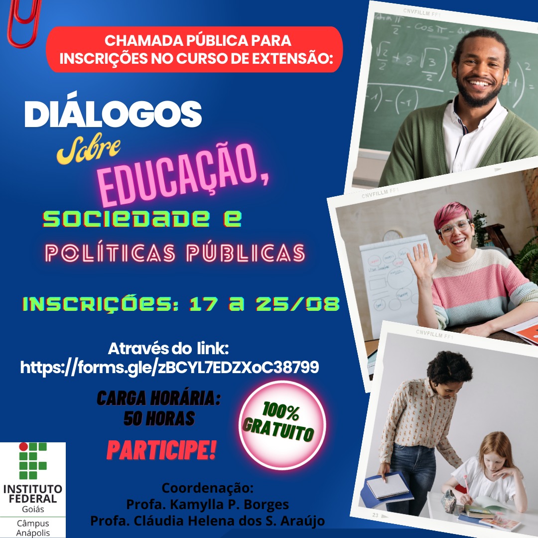 O público-alvo do curso de extensão é formado por estudantes das licenciaturas em Química e Ciências Sociais, dos cursos da educação de jovens e adultos (EJA) do IFG - Câmpus Anápolis; professores da Rede Municipal de Educação de Anápolis; alunos ingressantes no Mestrado Profissional em rede em Educação Profissional e Tecnológica sediado no Câmpus Anápolis (PROfEPT); estudantes de licenciaturas de outras instituições; professores dos Câmpus do IFG e ainda de outras instituições que estejam envolvidos com a temática da Educação e Políticas Públicas; interessados na temática apresentada de maneira geral. O curso é coordenado pelas professoras Kamylla Pereira Borges e Cláudia Helena dos Santos Araújo.