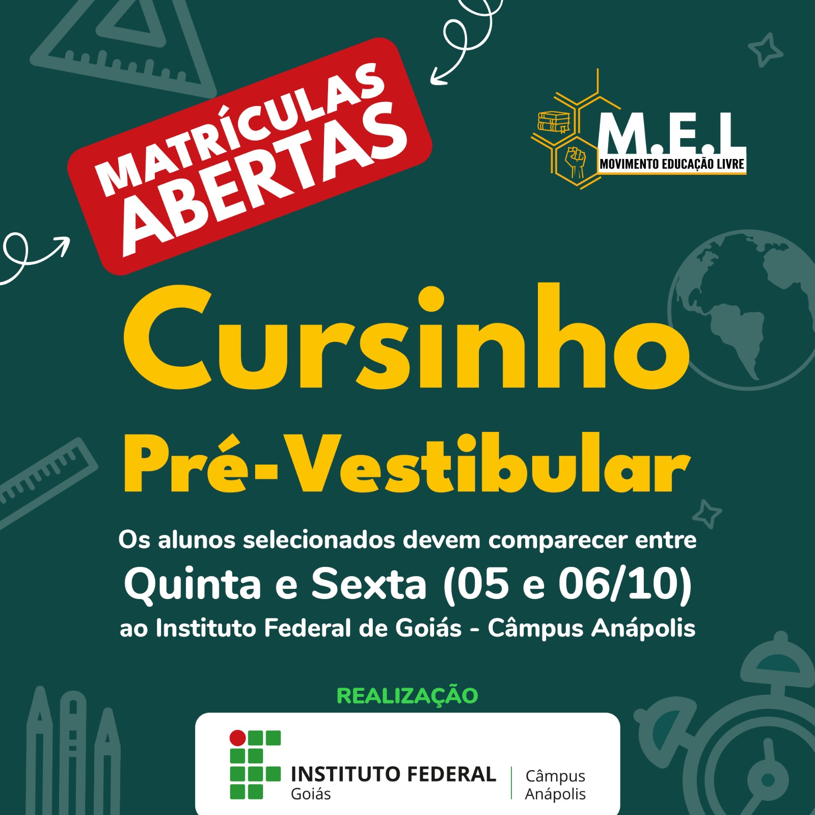 O Instituto Federal de Goiás (IFG) - Câmpus Anápolis, publicou o resultado final da seleção que disponibiliza 37 vagas para o Cursinho Pré-Vestibular/Enem Movimento Educação Livre. As matrículas estão sendo feitas presencialmente nesta quinta e sexta, 05 e 06 de outubro, na Gerência de Pesquisa, Pós-Graduação e Extensão (GEPEX) - Sala: S-301-IFG/Câmpus Anápolis entre 8 h e 20 h. O cursinho é totalmente gratuito e visa democratizar o acesso ao conhecimento e preparar jovens e adultos para os desafios do vestibular e da prova do Exame Nacional do Ensino Médio (ENEM). Veja o resultado aqui e leia o edital com instruções para matrículas aqui.
