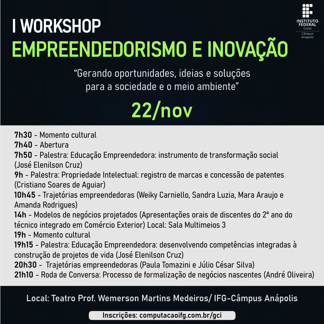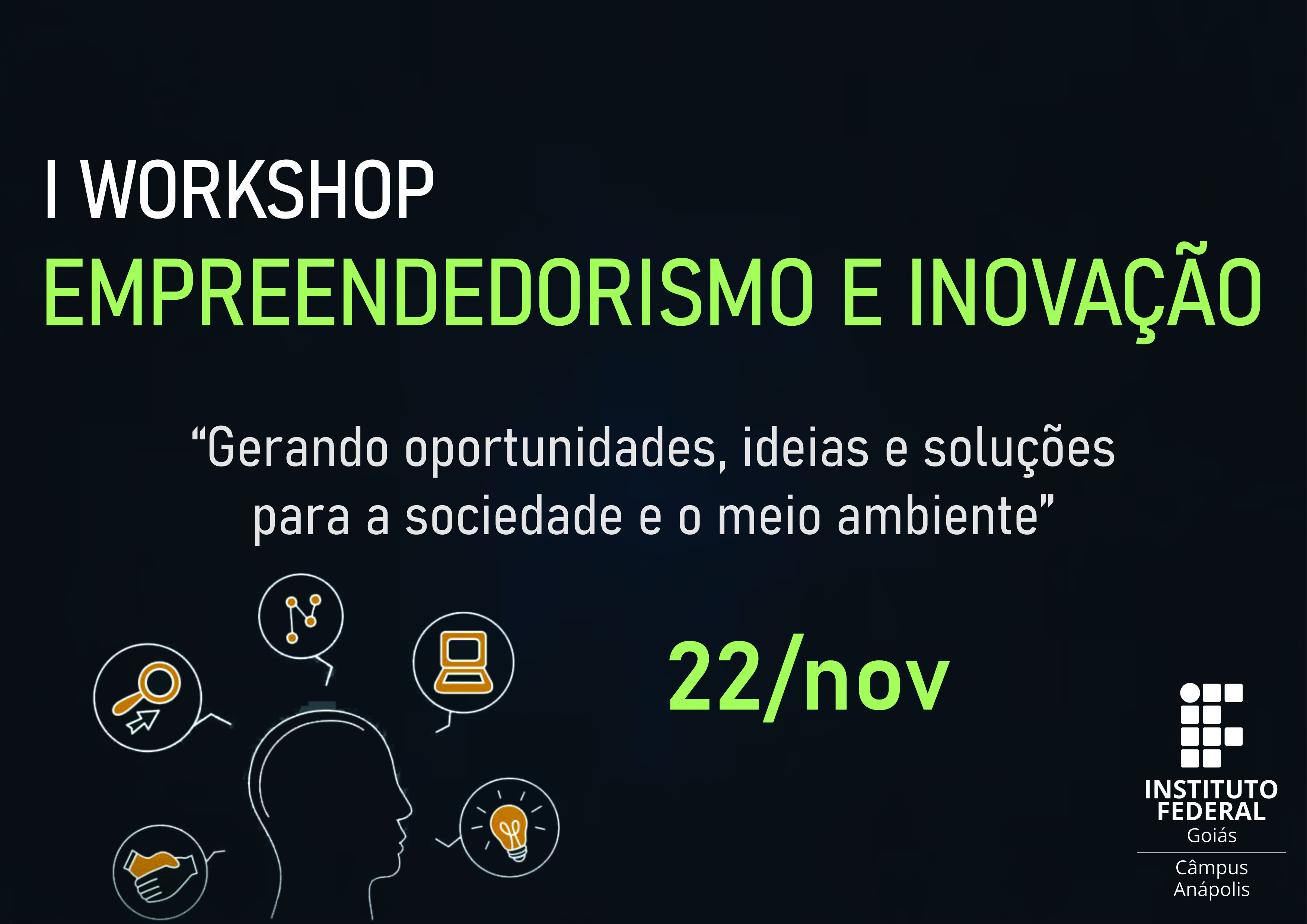O Instituto Federal de Goiás, IFG Anápolis realiza nesta quarta, 22, o I Workshop Empreendedorismo e Inovação. O evento ocorrerá nos três turnos e se comporá de palestras, apresentações orais de estudantes e roda de conversa. A abertura será às 7h30, com o Momento cultural, e a programação se encerrará à noite, com uma Roda de Conversa, às 21h10. As inscrições estão abertas no GCI.