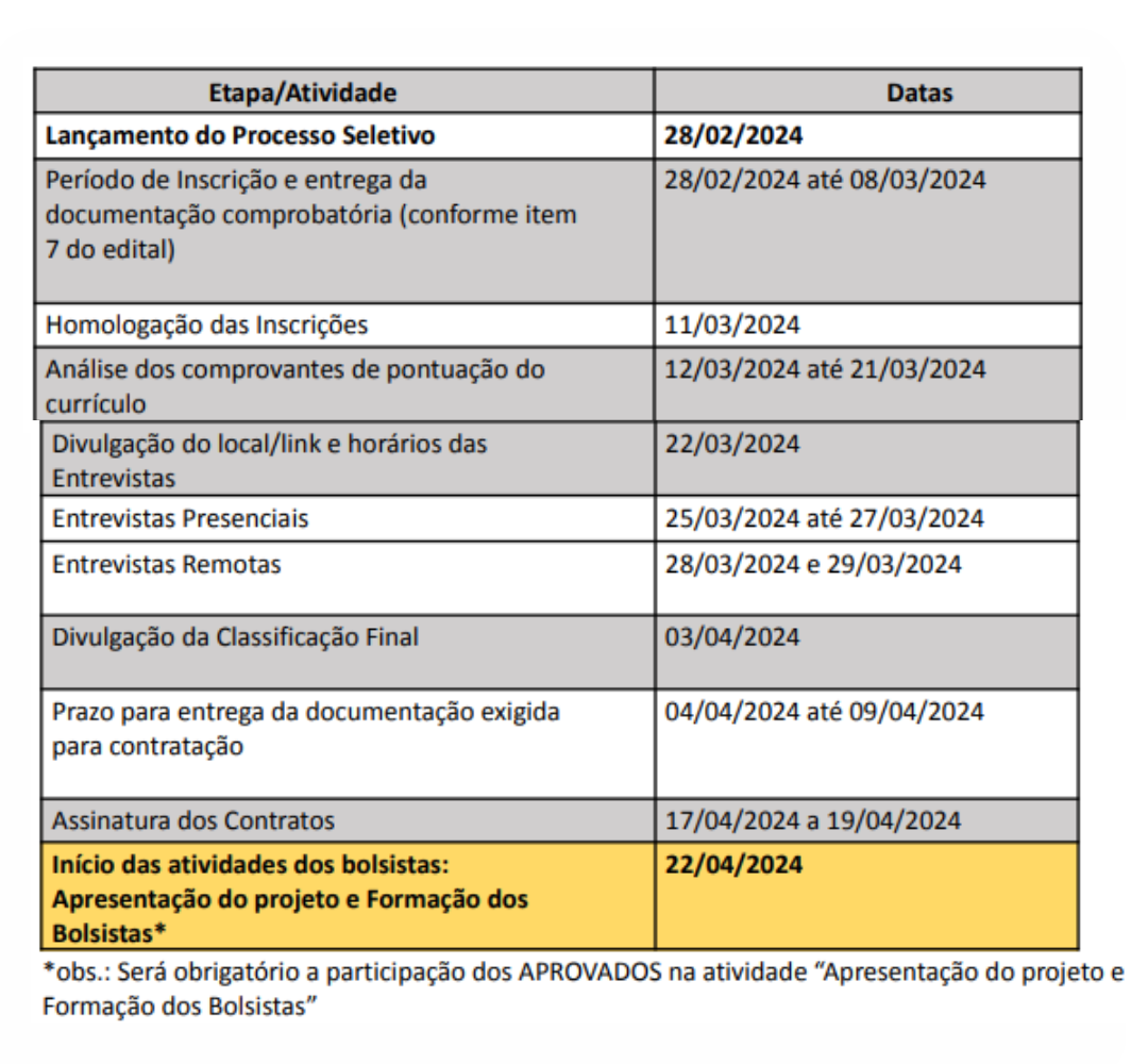 Os selecionados deverão desempenhar atividades de desenvolvimento do projeto de pesquisa, cursos de formação, eventos e demais demandas associadas ao projeto. Cada código de vaga possui atribuições básicas que devem ser consultadas no Quadro II do edital.