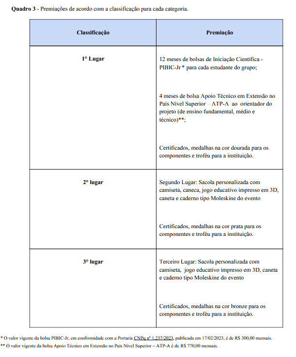 A avaliação dos trabalhos expostos será realizada por dois avaliadores com competência técnico-científica. Com base na avaliação do comitê científico, serão premiados os trabalhos de acordo com os níveis e categorias apresentadas no quadro a seguir: