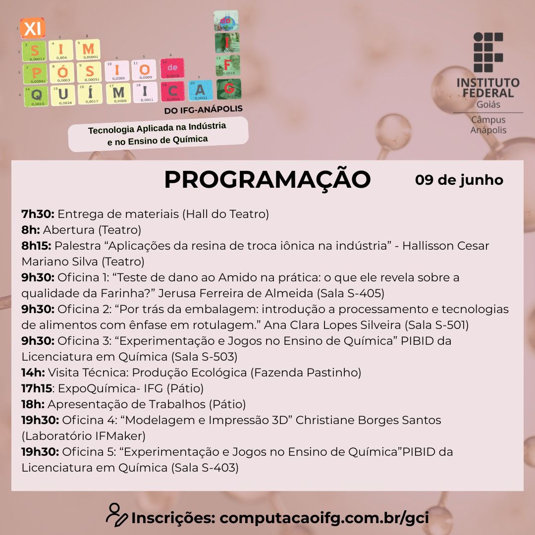 O XI Simpósio de Química do IFG terá o seguinte tema geral: Tecnologia aplicada na Indústria e no Ensino de Química. O evento é promovido pela Área de Química do IFG – Câmpus Anápolis, as inscrições devem ser feitas no GCI e a programação é a que se segue:
