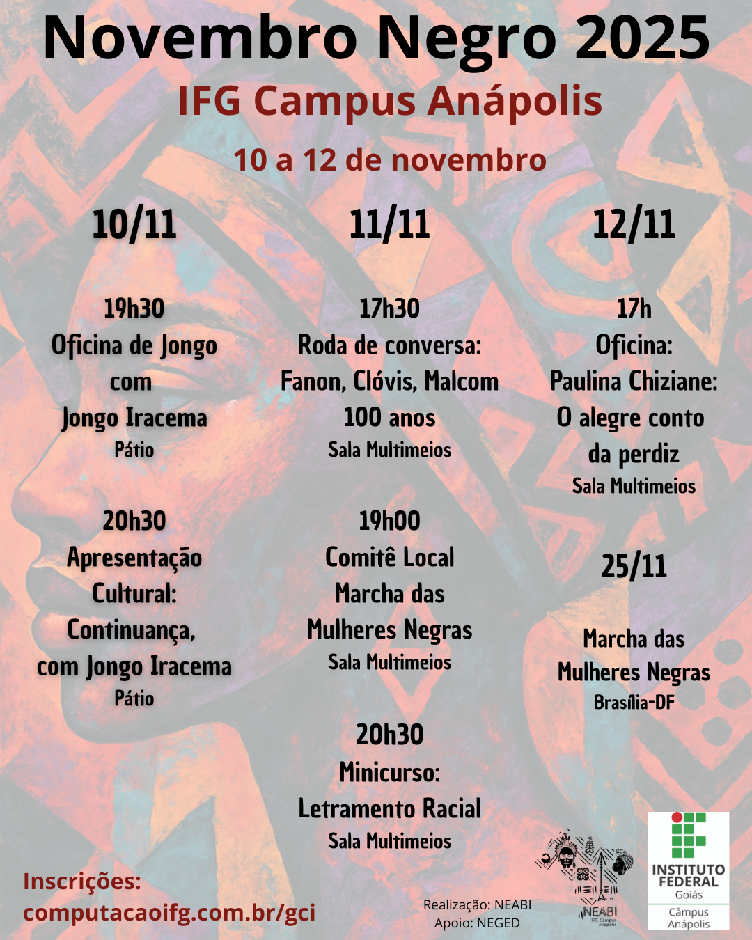 O IFG – Câmpus Anápolis dá início nesta segunda-feira, 10 de novembro, à programação do Novembro Negro 2025, uma ação promovida pelo Núcleo de Estudos Afro-brasileiros e Indígenas (NEABI) com apoio do NEGED, que busca fortalecer o debate sobre identidade, cultura, luta antirracista e valorização das matrizes africanas e afro-brasileiras.