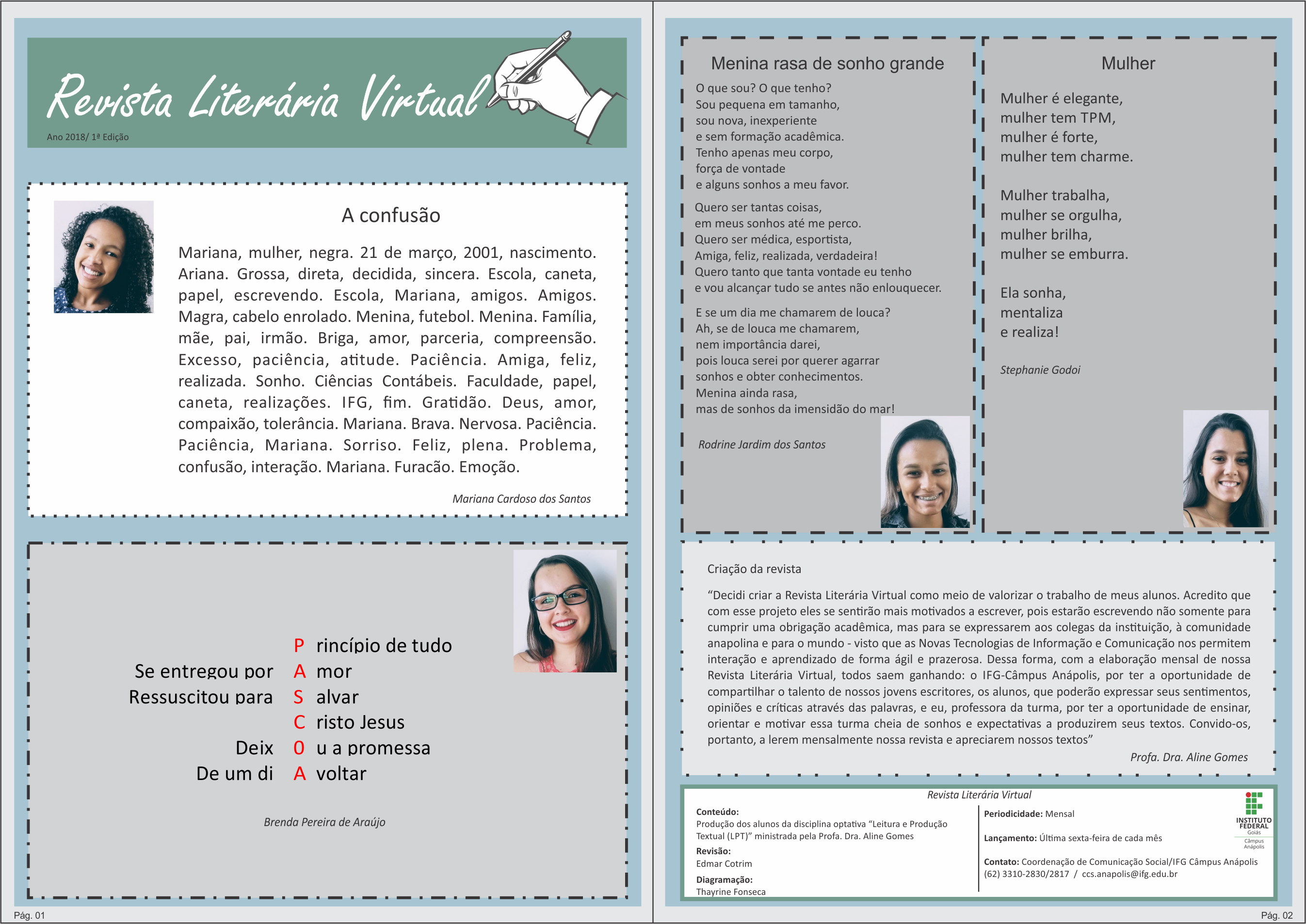 O Câmpus Anápolis do IFG lança neste mês de abril a Revista Literária Virtual, publicação que apresenta textos desenvolvidos por alunos da disciplina optativa “Leitura e Produção Textual”, que é ministrada pela professora Aline Gomes da Silva a 27 estudantes dos terceiros anos dos cursos técnicos integrados em Comércio Exterior, Edificações e Química. Com periodicidade mensal, ela será divulgada na última sexta-feira de cada mês no site e nas redes sociais oficiais do Câmpus Anápolis (Facebook, Twitter e Instagram). A equipe da Coordenação de Comunicação Social é parceira da iniciativa. Confira a primeira edição aqui.