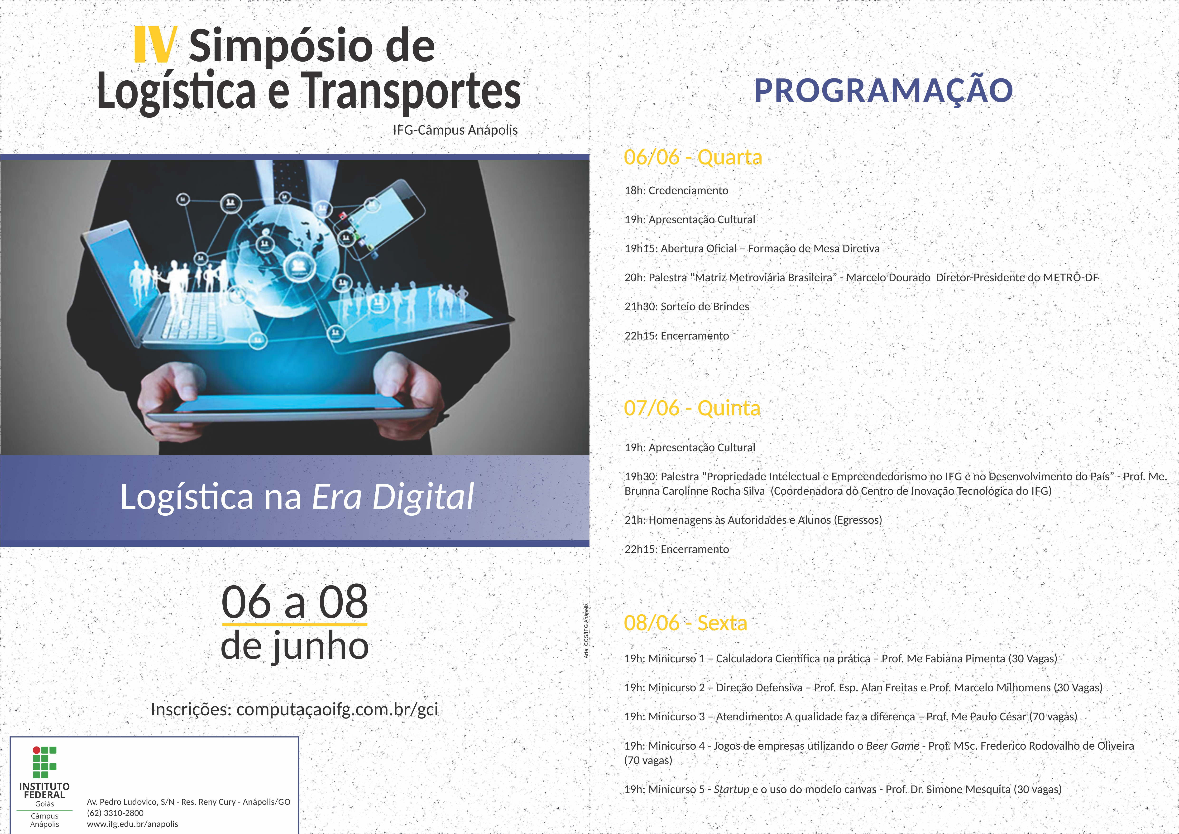 O Câmpus Anápolis do IFG realiza nesta semana o IV Simpósio de Logística e Transportes. O evento acontecerá de 6 a 8 – quarta a sexta-feira –, tem por tema "Logística na era digital" e se constituirá de palestras, homenagens, minicursos e apresentações culturais. Veja a programação completa aqui.