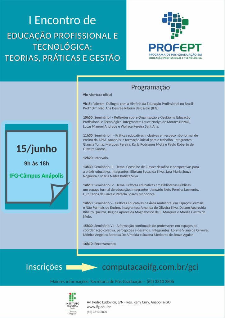 O Programa de Mestrado em Educação Profissional e Tecnológica (ProfEPT) do Instituto Federal de Goiás (IFG)- Câmpus Anápolis promove no próximo dia 15 de junho o I Encontro em Educação Profissional eTecnológica: Teorias, Práticas e Gestão. O evento é gratuito, aberto ao público em geral e será realizado no teatro do Câmpus. Os interessados em receber a certificação devem se inscrever para o Encontro no site https://computacaoifg.com.br/gci/. Haverá atividades nos períodos matutino e vespertino (Clique aqui para acessar a programação completa).
