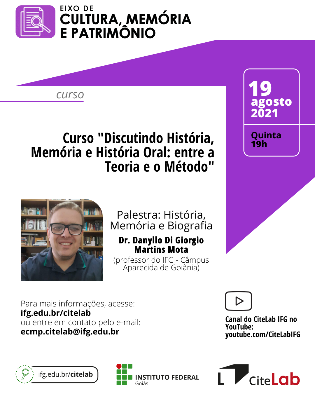 Uma reflexão sobre os usos da Memória e da História na construção de narrativas biográficas e sobre como essas narrativas se constituem em instrumentos que estabelecem novos sentidos à relação entre passado e presente e podem se tornar artefatos importantes na constituição e manutenção de grupos políticos nos espaços de poder. Com tal propósito será ministrada nesta quinta-feira, 19 de agosto, a palestra “História, Memória e Biografia”, pelo professor Danyllo Di Giorgio Martins da Mota. A atividade integra o segundo encontro do curso "Discutindo História, Memória e História oral: entre a teoria e o método”, promovido pelo Eixo de Cultura, Memória e Patrimônio do Centro de Referência em Pesquisa e Inovação do IFG – CiteLab, e terá transmissão ao vivo pelo canal do CiteLab no YouTube (https://www.youtube.com/CiteLabIFG).