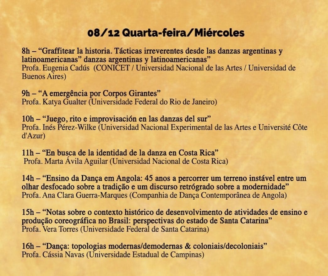 Sobre isso, a professora ainda reforça: “É um seminário extremamente pertinente, com temas muito urgentes, evidenciados na contemporaneidade, que é a questão do colonialismo, de como olhamos pra nossa dança enquanto colonizados. São discussões extremamente relevantes, de ponta, da produção do conhecimento em dança, em arte, em educação, e nós estamos juntos, compondo essa ação, essa programação, representando, inclusive, um grupo de pesquisadores que estão debruçados sobre memória e história da dança. Então, estamos muito contentes por esse momento de tamanha riqueza e troca de saberes.”.