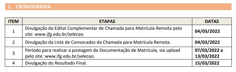 O cronograma para envio da documentação é o que segue abaixo: