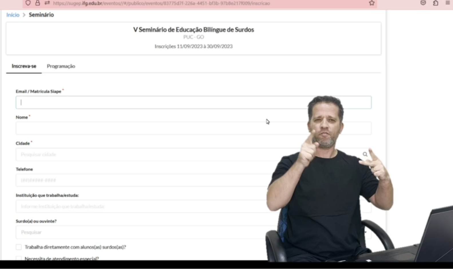 As inscrições para o V Seminário de Educação Bilíngue de Surdos e para submissão de trabalhos estão abertas e podem ser feitas no Sistema Unificado de Gestão de Extensão e Pesquisa (SUGEP) do IFG, neste link.
