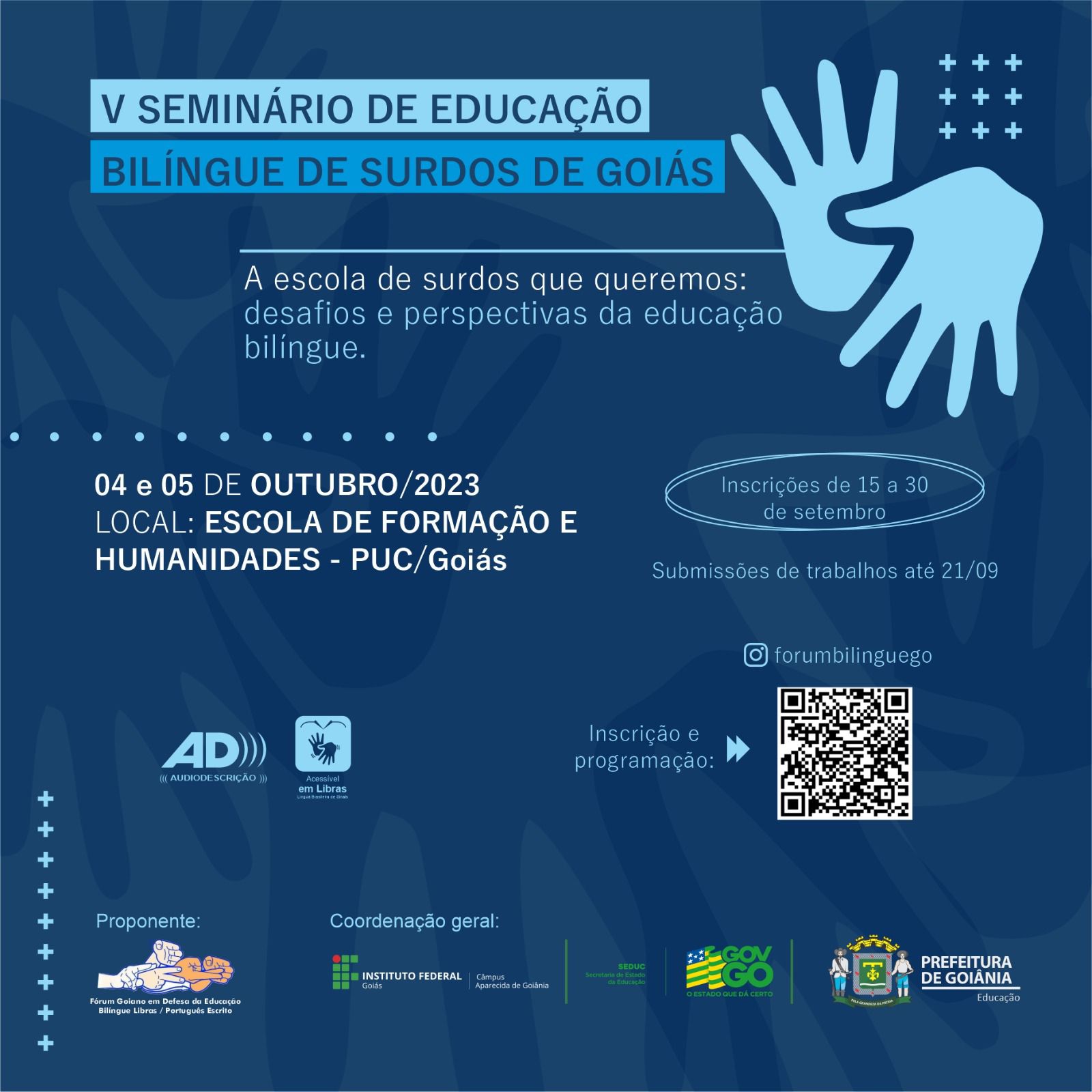 O Fórum Goiano em Defesa da Educação Bilíngue Libras/Português Escrito realizará nos dias 4 e 5 de outubro, o V Seminário de Educação Bilíngue de Surdos, com o tema “A escola de surdos que queremos: desafios e perspectivas da educação bilíngue”. O evento está com inscrições abertas e será realizado na Escola de Formação e Humanidades da PUC-Goiás . A submissão de trabalhos para apresentação em pôster foi prorrogada e pode ser feita até o dia 23 de setembro.