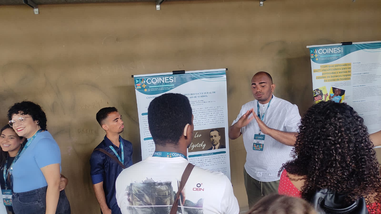 O XXII Congresso Internacional e Seminário Nacional do Instituto Nacional de Educação de Surdos (COINES) está sendo realizado na Universidade Federal do Rio de Janeiro (UFRJ) e tem o tema "Material Didático Bilíngue na Educação de Surdos". Ao todo 21 alunos do curso de Pedagogia Bilíngue do IFG estão participando presencialmente do evento, assistindo palestra e também apresentando pôsters com resultados de pesquisas realizadas. Além dos professores Diego Leonardo e Waléria Vaz, estão também presentes os professores Thiago Cardoso Aguiar e Joana Cristina Neves de Menezes Faria e, ainda, a gerente de Administração do IFG Aparecida, Raíssa Regis da Silva, que é pedagoga bilíngue.