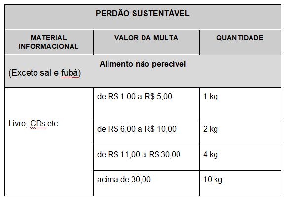 De 17 de outubro a 17 de dezembro de 2023 a Biblioteca do Câmpus Aparecida de Goiânia, juntamente com todas as demais bibliotecas do IFG e como parte da programação da 3ª Semana Nacional do Livro e da Biblioteca SIB/IFG, realizará a campanha do Perdão Sustentável, fazendo a troca da multa e outros débitos por doação de alimentos não perecíveis. O objetivo principal da campanha é recuperar os materiais informacionais em atraso e regularizar a situação dos/as usuários/as nas Bibliotecas do IFG que estiverem com multa. Todos os alimentos arrecadados serão doados aos servidores terceirizados do IFG Câmpus Aparecida de Goiânia.