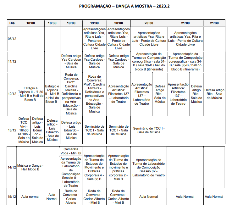 Apresentações artísticas -- incluindo uma camerata vocal, defesas de trabalhos acadêmicos e rodas de conversa unem estudantes, professores e convidados externos em seis dias da programação do Dança à Mostra. O coordenador do curso de Licenciatura em Dança, professor Germano Henrique Pereira Lopes, explica que o principal objetivo do evento é a troca de experiências e vivências que vão além de um momento de exposições e apresentações, sendo também um momento formativo.
