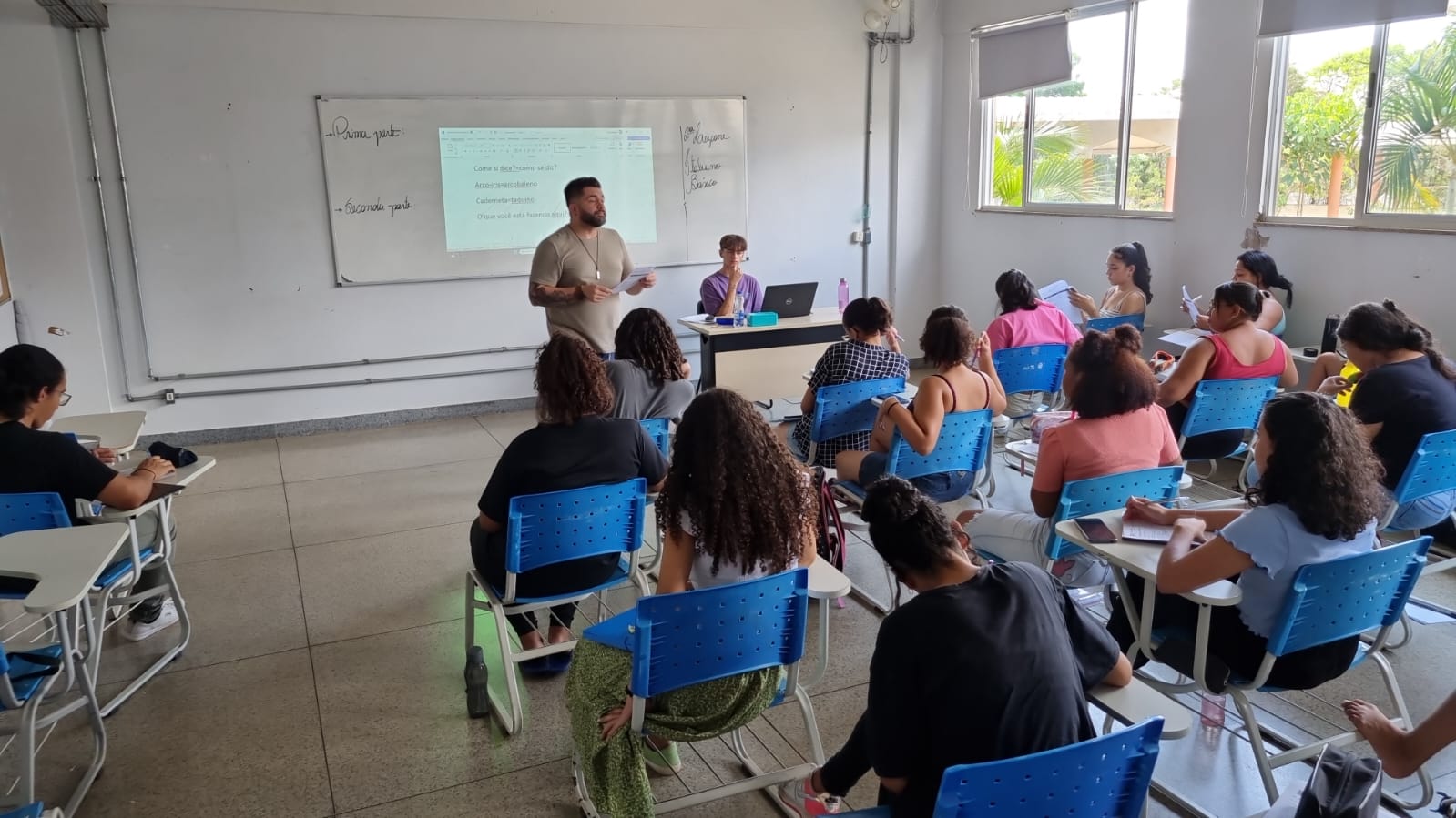 Aula prática de italiano, envolvendo vocabulário e cultura na área de culinária, com a presença de estudantes do EMI e intercambistas