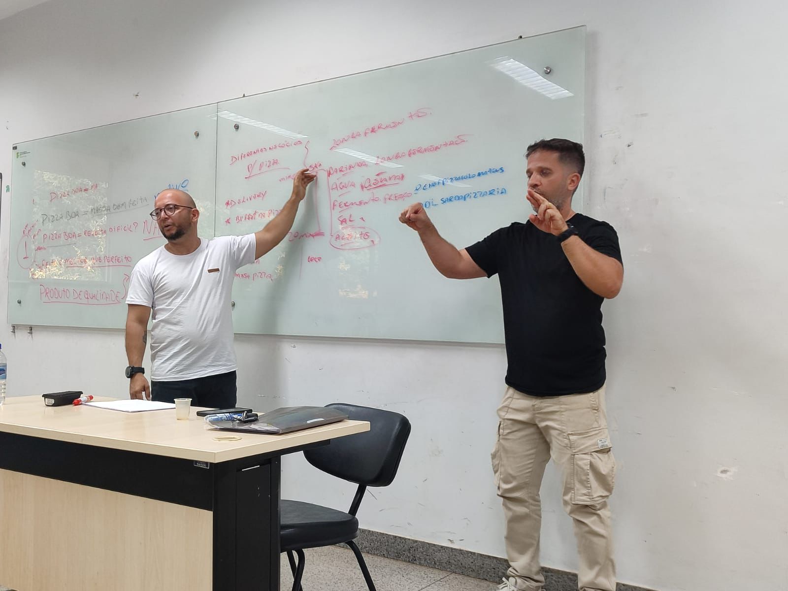 As aulas do “Sabores em Libras: Pizza” foram iniciadas no dia 21 de setembro e são totalmente presenciais, a serem concluídas em três tardes de sábado, totalizando 15 horas. A primeira aula foi teórica e abordou pontos como a preparação da massa, empreendedorismo, precificação e outros assuntos. A segunda aula tratou de recheios e a parte prática da preparação da massa. O curso será encerrado no próximo sábado, dia 5 de outubro, quando os alunos vão montar e assar pizzas e confraternizar saboreando os seus produtos. “O pessoal vai aproveitar pra comer muita pizza”, comemora o professor Thiago Aguiar.