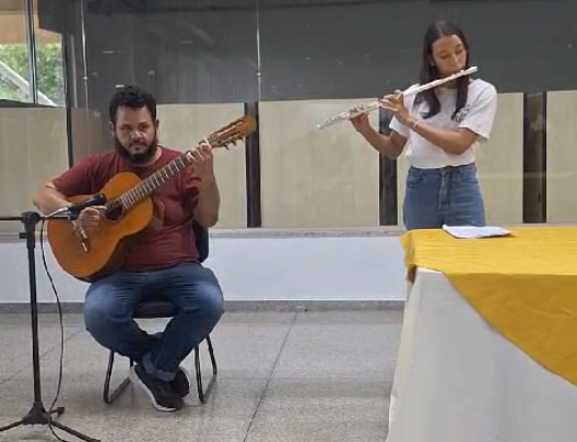 A programação seguiu com uma declamação de poesia pela estudante Eduarda Rodrigues e, logo após, a servidora Daniela Rodrigues de Rezende, cantou a música “Pintor do Mundo”, de autoria de Pastor Lucas, acompanhada ao violão pelo servidor Diego Inocêncio. Os dois interpretaram outras músicas e foram muito aplaudidos. A programação do Sarau abriu espaço para apresentações voluntárias, que foram feitas com declamação de poesia pela professora Alix Bandeira e pela leitura de um texto literário pela técnica administrativa Regina Magnabosco.