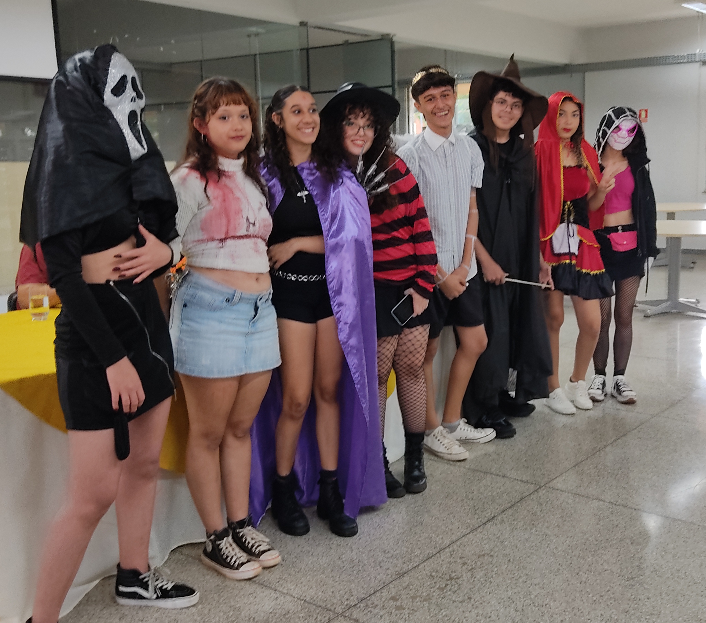 Representando o Grêmio, a estudante Isadora anunciou o desfile de fantasias de halloween, festa também conhecida como dia das bruxas e que é celebrada em 31 de outubro. Os adolescentes usaram a criatividade para criação de fantasias que utilizaram no desfile diante da plateia do Sarau. Em seguida, o professor Thiago Anunciacao Rezende e a estudante Isabella Malaquias da Silva fizeram uma emocionante apresentação em violão e flauta transversal. Eles executaram a música “Valsinha”, de Chico Buarque e Vinícius de Moraes.