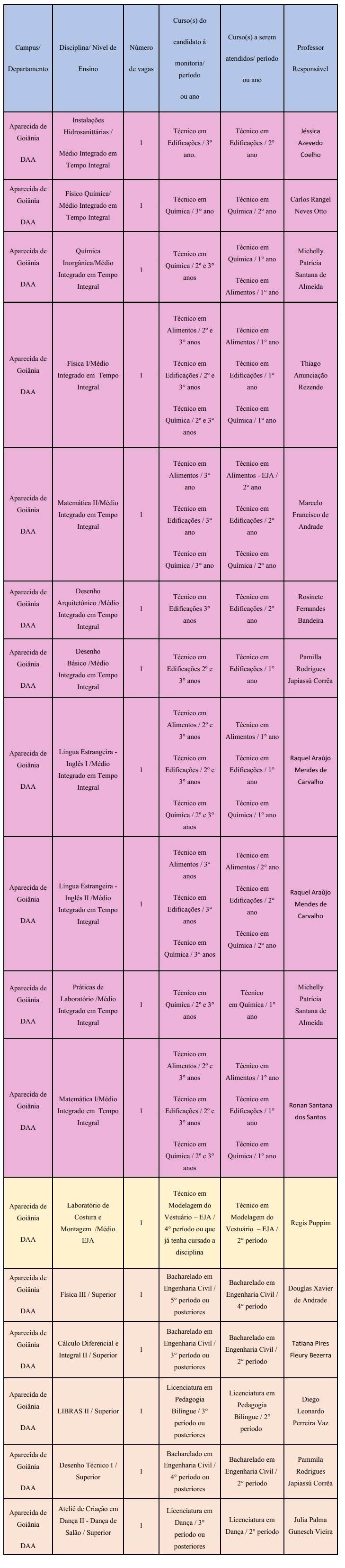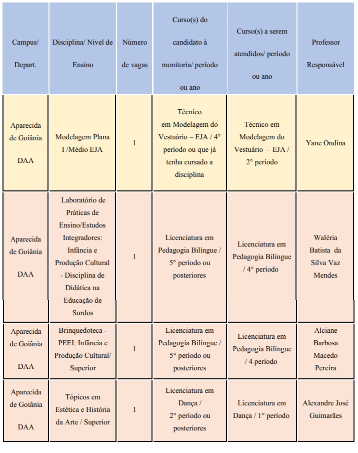 O Departamento de Áreas Acadêmicas (DAA) do IFG Aparecida de Goiânia abre seleção para preenchimento de 21 vagas de monitoria, sendo 4 vagas para monitoria remunerada e 17 vagas para monitoria voluntária. As inscrições têm início hoje, 04 de novembro, e seguem até domingo, 10 de novembro e podem ser feitas nos seguintes links: