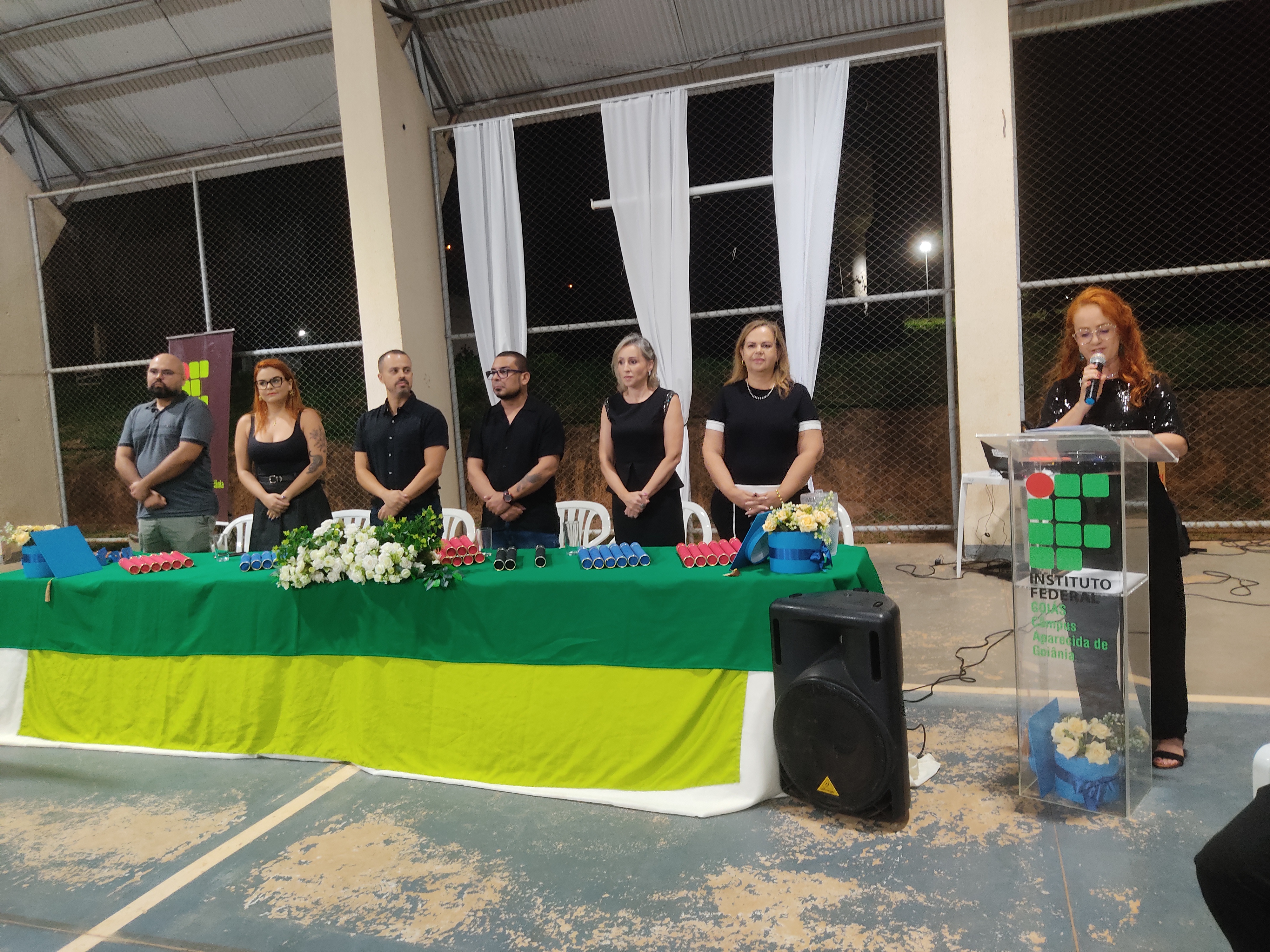 A mesa diretiva da cerimônia foi composta por seis professores: o diretor-geral do câmpus, Eduardo de Carvalho Rezende; o chefe do Departamento de Áreas Acadêmicas, Marcos Flávio Mércio de Oliveira; a coordenadora do curso técnico integrado em Alimentos da modalidade EJA, Ruskaia Fernandes Mendonça; a coordenadora do curso técnico em Alimentos, Priscilla Prates de Almeida; a coordenadora do curso técnico em Edificações, Rosinete Fernandes Bandeira; e o coordenador do curso técnico em Química, Raul Vítor Rodrigues Peixoto. A solenidade foi aberta e conduzida pela gerente de Pesquisa, Pós-Graduação e Extensão, professora Gláucia Rosalina Machado Vieira, que foi mestre de cerimônias.