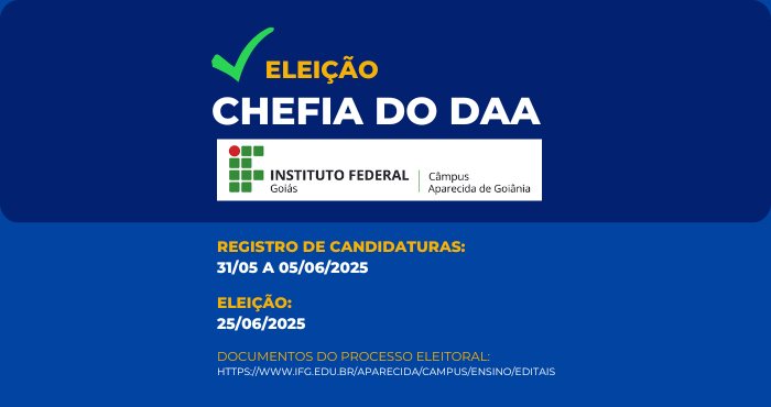 A Direção-Geral do Câmpus Aparecida de Goiânia do Instituto Federal de Goiás dá início aos procedimentos necessários para que ocorra nova eleição da hefia de Departamento de Áreas Acadêmicas, para o biênio 2025/2027. A votação deve ocorrer no dia 25 de junho de 2025, conforme Circular nº 105/2025, de 29 de maio de 2025, expedida pela Pró-Reitoria de Ensino, que oficializa o cronograma das atividades do processo eleitoral.