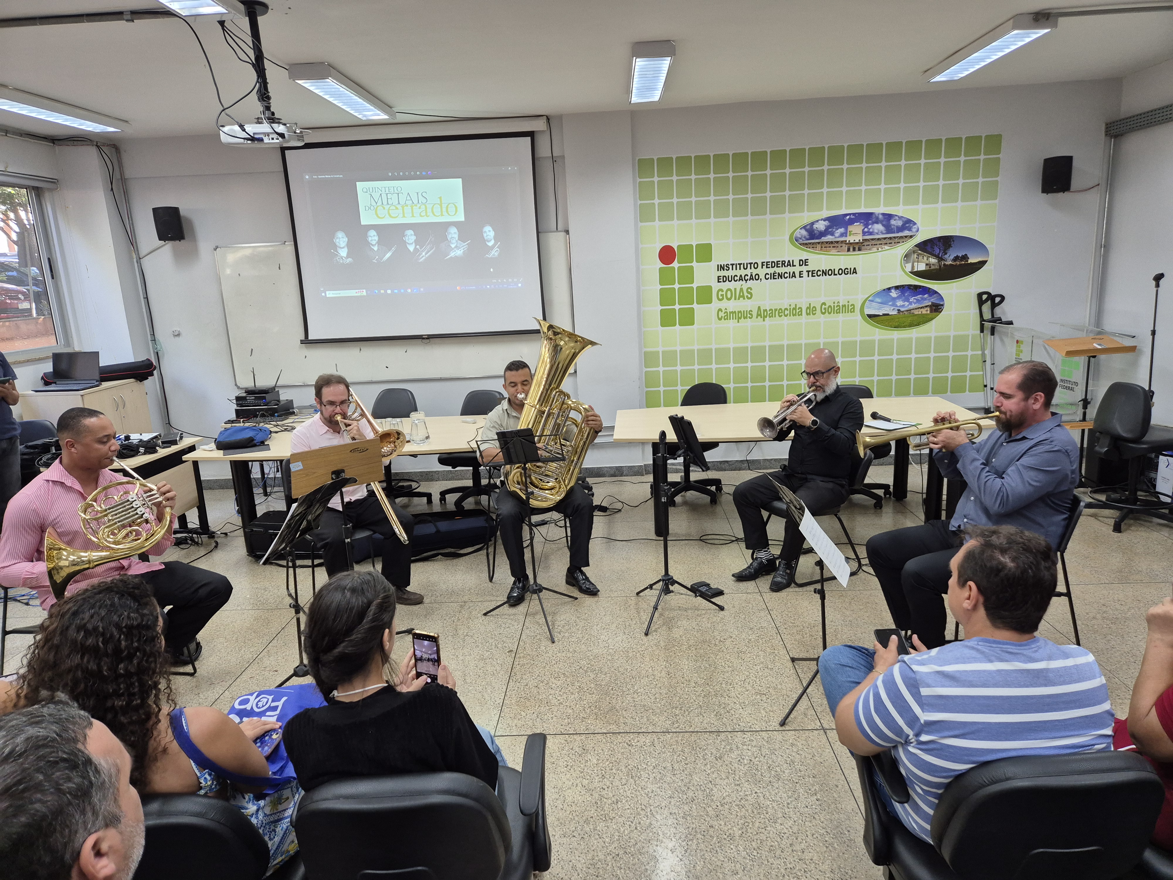 O encerramento do I Encontro de Debates sobre Educação Básica e Formação de Professores do Centro-Oeste foi antecedido por apresentação musical do Quinteto Metais do Cerrado, grupo de extensão da UFG em parceria com o IFG. Foi executado um repertório de músicas populares brasileiras, com informações dadas ao público de forma didática as composições, arranjos e curiosidades envolvendo os compositores. “Pra nós, não faz sentido não poder compartilhar o que a gente constrói”, disse o trompetista Alessandro da Costa em seu agradecimento ao final das apresentações.