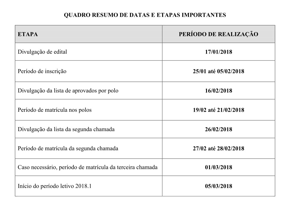 A divulgação do resultado da primeira lista de aprovados será no dia 16 de fevereiro, no site: http://neo.ines.gov.br. A matrícula dos candidatos classificados será efetuada presencialmente na secretaria da Instituição de Educação Superior para a qual se inscreveu, entre os dias 19 a 21 de fevereiro de 2018.