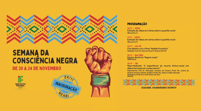 As atividades começam nesta segunda-feira, 20 de novembro, Dia Nacional da Consciência Negra, e seguem até sexta, quando será lançado o NEABI do câmpus