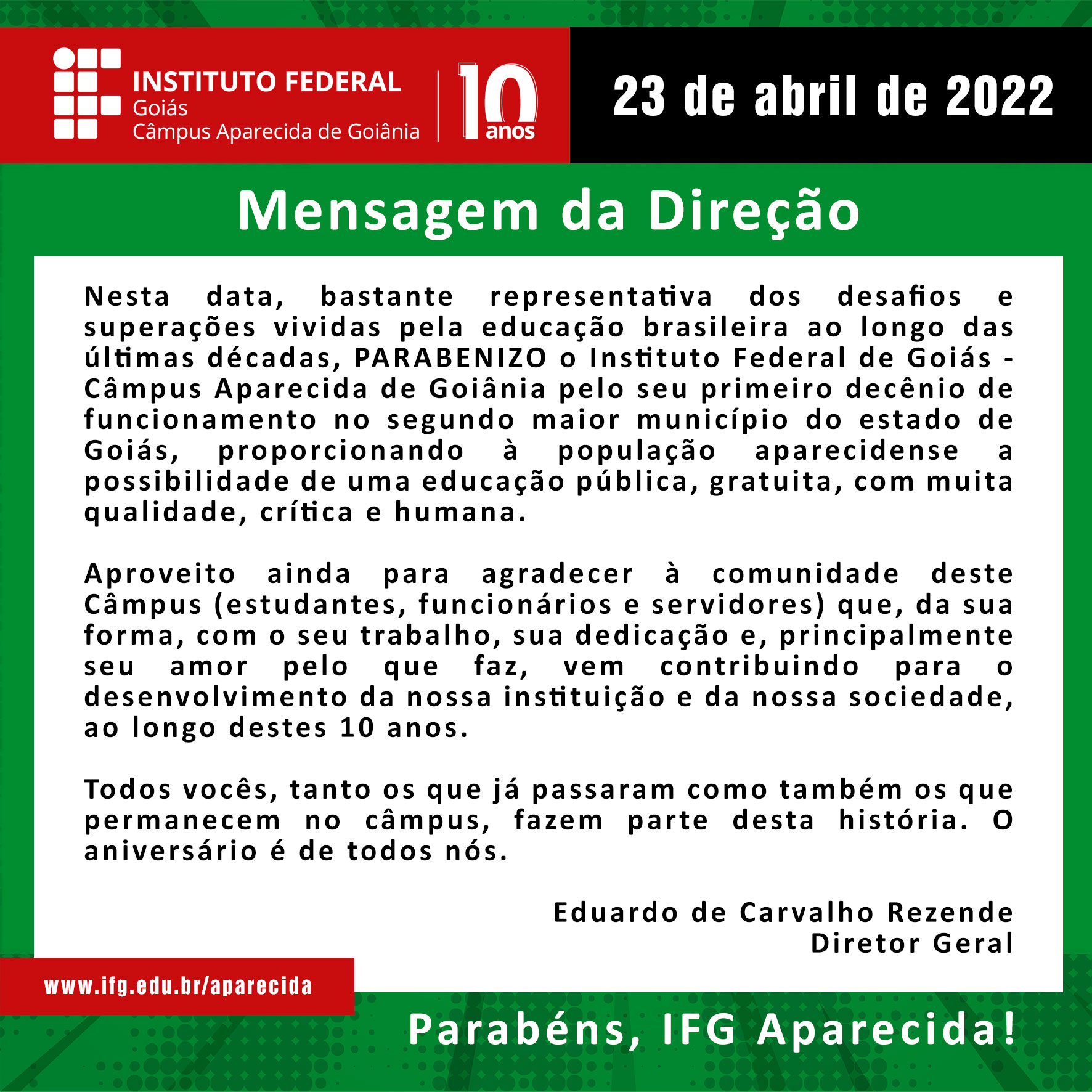 [[ 23 de abril de 2022 ]] E finalmente é chegado o grande dia, em que o Câmpus Aparecida de Goiânia, do Instituto Federal de Goiás, completa seu primeiro decênio na segunda...