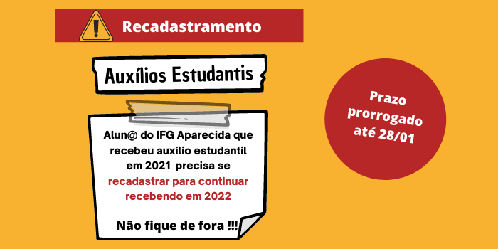 O estudante que recebeu auxílios Alimentação, Moradia, Permanência ou EJA Permanência em 2021 precisa fazer o recadastramento para continuar recebendo em 2022
