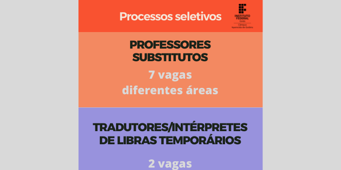 São oferecidas sete vagas para professor substituto, com inscrições abertas até dia 5 de fevereiro, e duas vagas para tradutor/intérprete de Libras, com inscrições até dia 9 de...