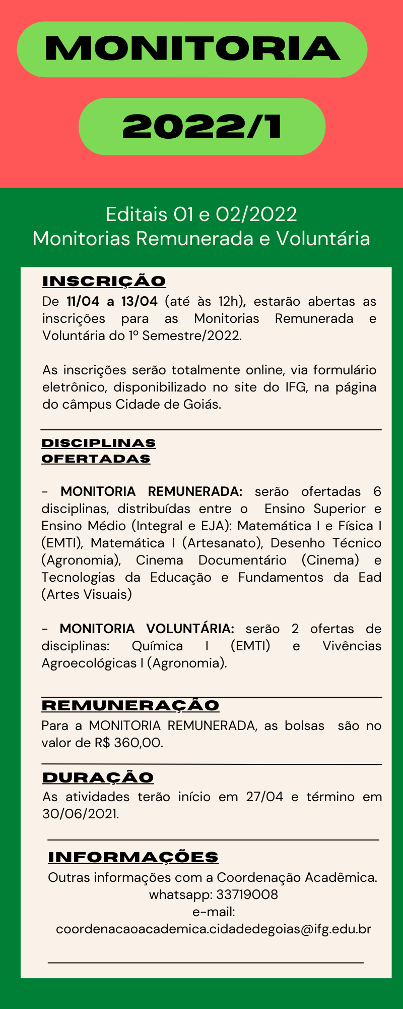 As vagas disponíveis na monitoria remunerada são nas seguintes disciplinas: Física I (Ensino Médio); matemática I (Ensino Médio); matemática I (Ensino Médio, modalidade EJA); Desenho Técnico (Ensino Superior - Agronomia); Cinema Documentário (Ensino Superior - Cinema); Tecnologias da Educação e Fundamentos da EAD (Ensino Superior - Artes Visuais).