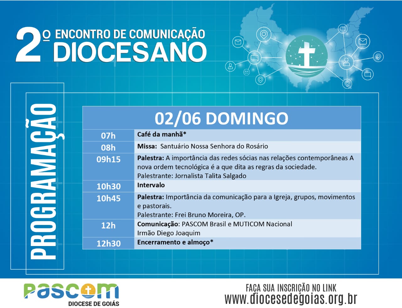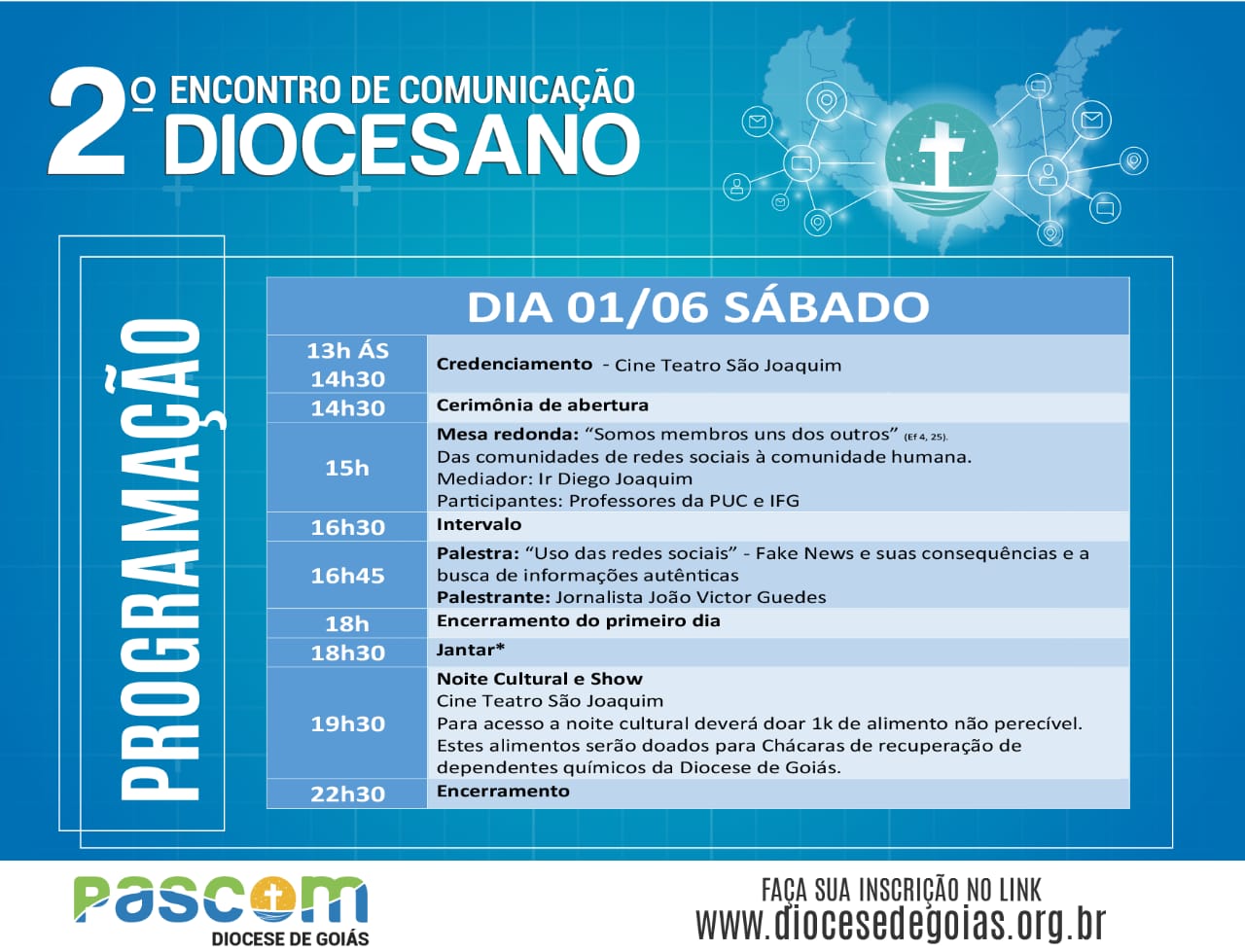 Haverá nesse final de semana, 01 a 02 de junho, o 2º Encontro de Comunicação Diocesano na Cidade de Goiás no Teatro Joaquim com a seguinte temática: “Somos membros uns dos outros. Das comunidades de redes sociais à comunidade humana”. O evento é uma realização da Diocese de Goiás em parceria com o IFG que fornecerá a certificação aos participantes.